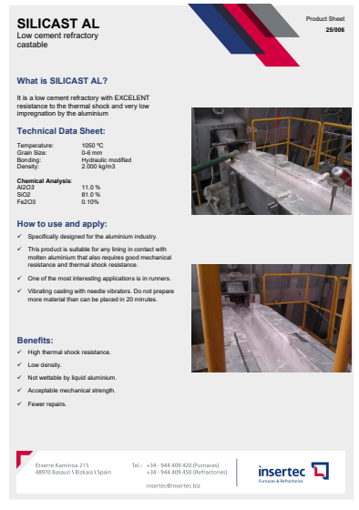 To meet these needs, we have developed Silicast AL, a low-cement refractory concrete with excellent thermal shock resistance and very low impregnation by molten aluminium.